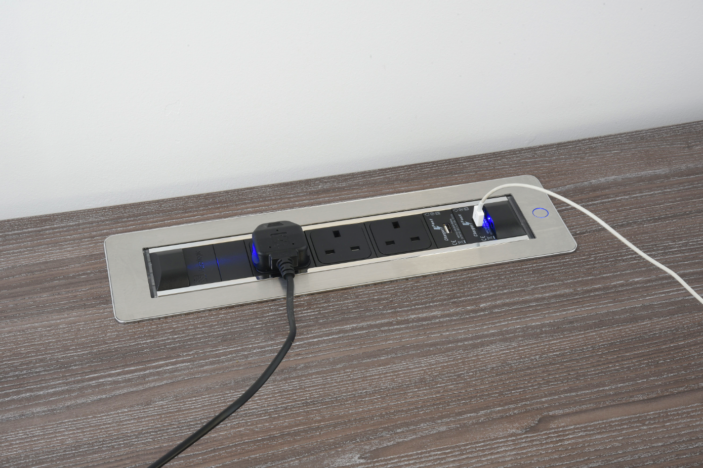A motorised revolving Control Panel that rotates to offer a blank plate, or a dedicated control panel, featuring options of Power, VGA, Cat 6 Data, HDMI & 5v Charging USB in a mix of configurations.A discreet led button activates the rotating barrel and all units come supplied with 2 Metre Long Cables and in choice of finishes. Different configurations are available as a special order, subject to certain minimum order quantities.